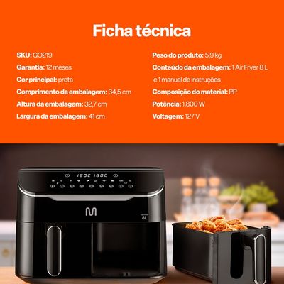Cozinha moderna e inteligente para quem precisa de agilidade no dia a dia. Garanta muito mais praticidade e inovação na rotina da sua família com a Air Fryer 8 L com 2 gavetas da Multi.