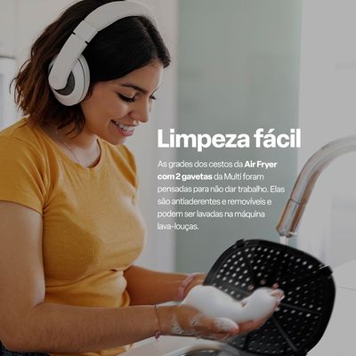 A grade da Air Fryer com 2 gavetas da Multi foi pensada para não dar trabalho. Ela é antiaderente e removível, facilitando a lavagem da grade e do cesto.