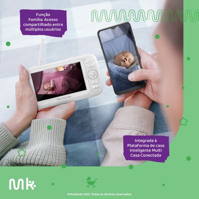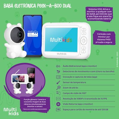 Com a Peek-a-Boo Dual você tem ambas as opções em um único produto! A conexão pelo celular via app, permite acesso de qualquer lugar, perto ou longe. Já a conexão pelo monitor conta com unidade dos pais dedicada e permite que você use seu celular para outras coisas sem perder um segundo sequer do soninho do seu pequeno. Tem mais de um usuário? Não tem problema! A função família do app permite que você compartilhe o acesso para outros usuários, bastando adicionar cada um pelo próprio app! Tem mais de um bebê pra olhar? Também não tem problema! Comprando a câmera avulsa da Peek-a-boo (bb469) é possível acompanhar as duas câmeras, tanto pelo monitor quanto pelo celular, ao mesmo tempo. Com resolução de 1080P e transmissão de 15 frames por segundo, a Peek-a-boo conta com visor colorido tanto no monitor quanto no app. Seu campo de visão é de 100 graus e conta com visão noturna que permite que você fique de olho no bebê mesmo quando o quarto estiver escuro. O áudio bidirecional permite que você fale e escute o seu bebê à distância, tanto no monitor quanto pelo celular. Os detectores de som e movimento ajudam a identificar facilmente o que o seu pequeno está fazendo e se ele precisa de você. A luz interna, quando acionada pelo app, transforma a babá em uma luminária que pode ser programada para desligar automaticamente via timer. Além de tudo isso, conta com um sensor de temperatura que pode ser programado para avisar quando a temperatura não estiver adequada para o bebê e uma coleção de canções de ninar ativadas via app ou monitor. No app, seu zoom permite que a imagem seja aumentada em até 6 vezes para que você possa ver seu bebê de pertinho mesmo se a câmera estiver um pouco mais longe do berço. Além da transmissão em tempo real, é possível gravar ou tirar fotos para verificação posterior. E se você estiver sem espaço para armazenar essa coletânea cheia de fofura, pode ficar tranquilo! Ela tem espaço para você colocar um cartão de memória e não perder nadinha! Com suporte para parede e capa em formato lúdico de ursinho, a Peek-A-Boo além de trazer comodidade e segurança, combina com o quarto do seu bebê. A babá eletrônica Wifi Peek-A-Boo une a qualidade Multikids que você e seu bebê já conhecem e confiam à tecnologia de ponta da Multi. O acesso pelo aplicativo Multi Liv permite acesso e controle pela casa conectada e é compatível com IOS e Android.