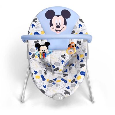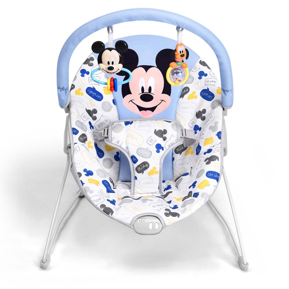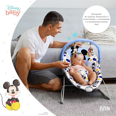 2 brinquedos inclusos — chocalho e argola nos formatos do Mickey e Pluto — que estimulam o desenvolvimento sensorial e motor.
