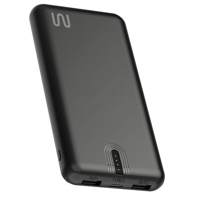 Seu design inteligente conta com duas saídas USB-A para carregamento simultâneo, permitindo carregar dois dispositivos ao mesmo tempo. Possui também uma entrada USB-C que serve para recarga do próprio power bank, oferecendo ainda mais versatilidade.