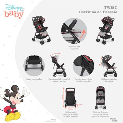 Do nascimento aos 15 kg, o Carrinho de Passeio Twist Mickey acompanha todas as fases do seu bebê.
