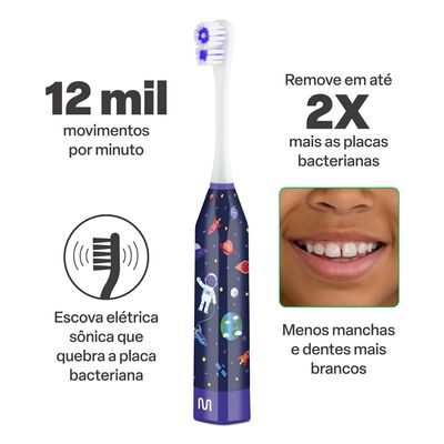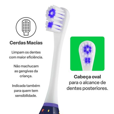 Com incríveis 15 mil movimentos sônicos por minuto, nossa escova quebra a placa bacteriana de forma eficiente, garantindo uma limpeza profunda. As cerdas macias são delicadas com a boca da criança, proporcionando uma experiência confortável durante a escovação.