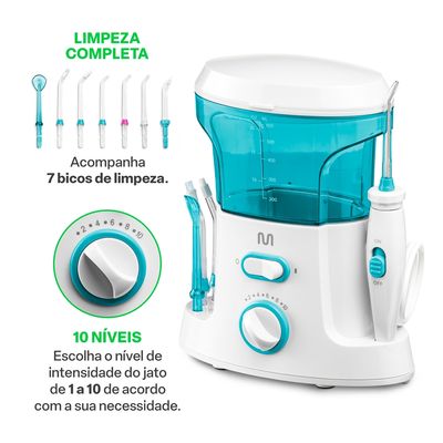 Irrigador Oral Clearpik Familyproporciona limpeza bucal profunda para toda família. Ele possui intensidade regulável com 10 ajustes de pressão para você controlar a intensidade ideal garantindo o conforto no momento da limpeza. Bivolt automático, possui reservatório de 600 ml e acompanha um kit completo de 7 bicos para você usar como precisar.