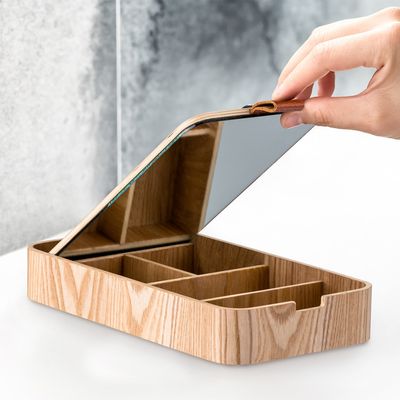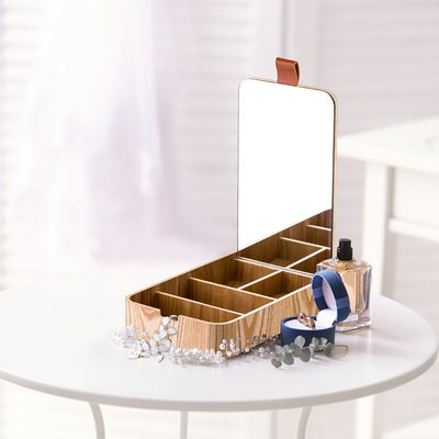 Seu material é de madeira, trazendo modernidade e estilo para a bancada do seu banheiro ou quarto. Além disso, o Porta-Joias contém um espelho, para você checar como ficou a sua composição e arrasar!