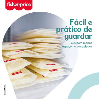 25 unidades com capacidade de 200ml, ideais para armazenar porções adequadas de leite materno com praticidade. O Saquinho para Armazenar Leite Materno Fisher-Price é a escolha perfeita para mães que buscam confiança, organização e cuidado em cada detalhe.