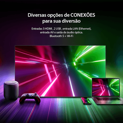 A Tela 4k Toshiba possui 3 entradas HDMI e 1 entrada AV para conectar facilmente dispositivos como videogames e reprodutores de mídia para uma experiência de entretenimento completa. A saída de áudio óptica permite a conexão de sistemas de som externos para uma qualidade de áudio ainda melhor.